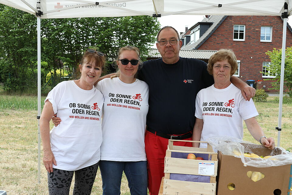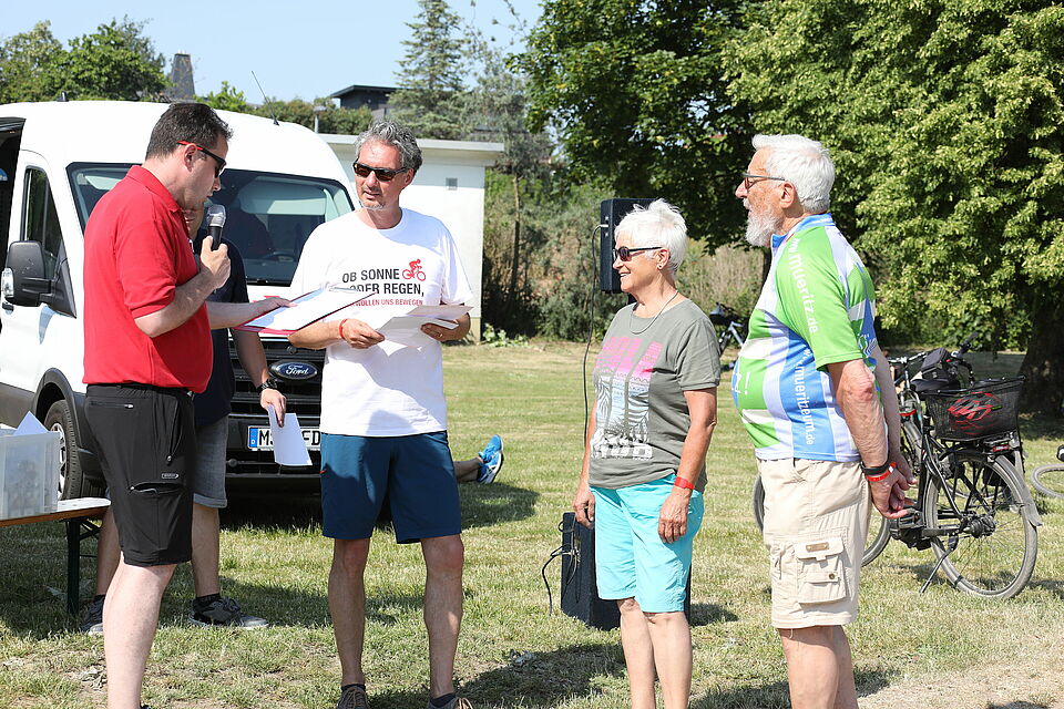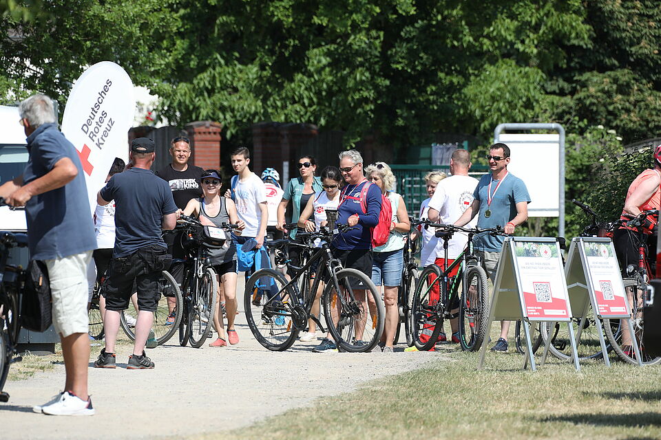 Hier warteten Medaillen und Urkunden für alle Teilnehmer*innen und Ronny Möller mit der Auswertung der 16. DRK Zwei-Rad-Tour. „Über das freiwillige Startgeld kamen 2.383 Euro zusammen.“, so der Rotkreuzler, der noch weitere Zahlen auf seinem Zettel zu stehen hatte.