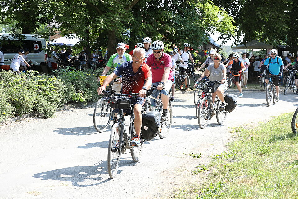 Erstes Ziel, der Fahrradstopp in Rechlin. Eine kleine Obstpause zur Stärkung und kühle Getränke sorgten für einen Energieschub. Denn warme Luft begleitete den Corso, der um einige Radler*innen in Rechlin verstärkt wurde. Um 13 Uhr saß die Fahrradgemeinschaft gemeinsam beim Mittagsimbiss am Röbeler Stadthafen. Danach ging es weiter in Richtung Sietow Dorf, dem Start der Familien-Tour - dort stieg die Anzahl der Zweiräder an, unter ihnen auch viele Kinder, um die verbleibenden 20 Kilometer bis nach Waren (Müritz) zu fahren.