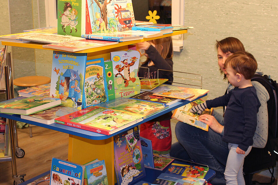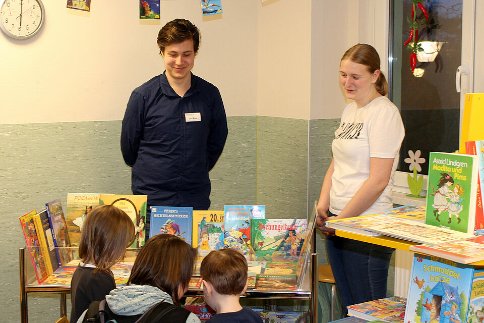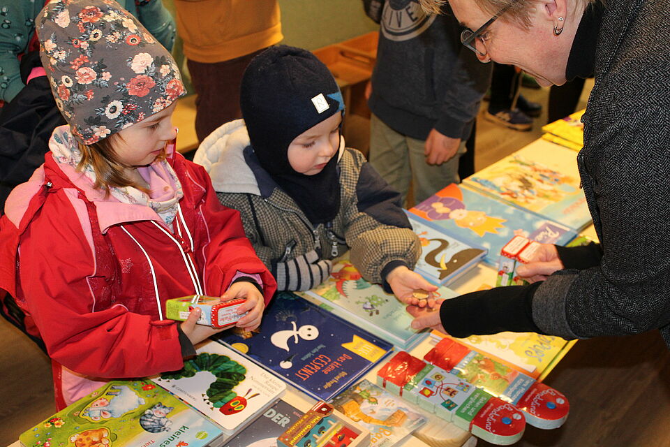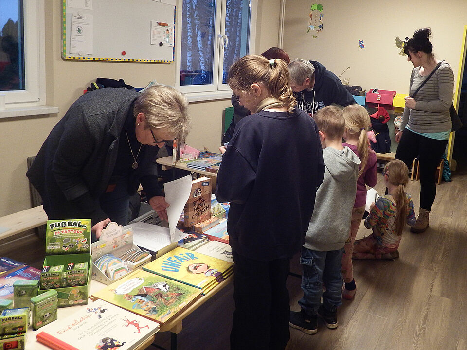 Zwischen den Lesungen hatten die Besucher die Möglichkeit, Lesezeichen zu gestalten und Buchecken zu falten. Frau Märzke und Frau Paskhalova aus dem Neustrelitzer Kunsthaus unterstützten dabei jeden Teilnehmer. Am Stand der „Bücherei Rilke“ konnten die Besucher Bücher und andere Lesematerialien erwerben, wobei besonders die Bücher der Vorlesungen bei den Kindern sehr beliebt waren. Die Kinder wurden aufgerufen, ein ungenutztes Buch von zu Hause mitzubringen und es an unseren Büchertauschregalen gegen ein anderes Buch zu tauschen. Unsere Auszubildenden Jordan und Bastian halfen gerne bei der Auswahl. Im Café konnten die Besucher gemeinsam Buchstabensuppe essen und Alphabet-Kekse knabbern, um ihren Hunger zu stillen, bevor es zur nächsten Lesung ging.