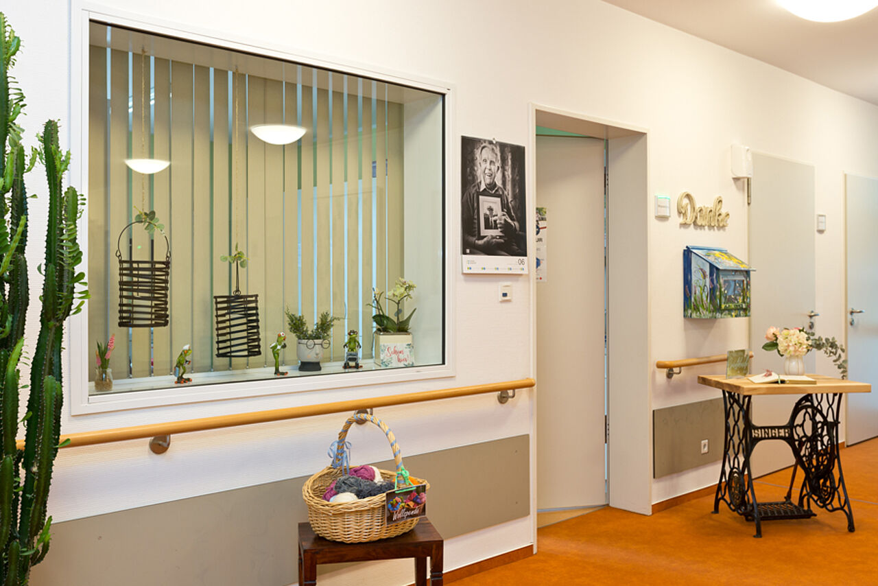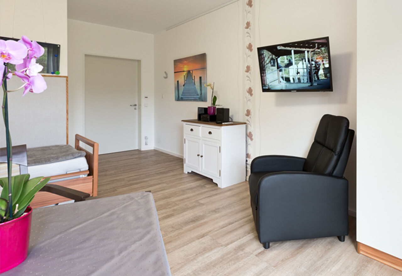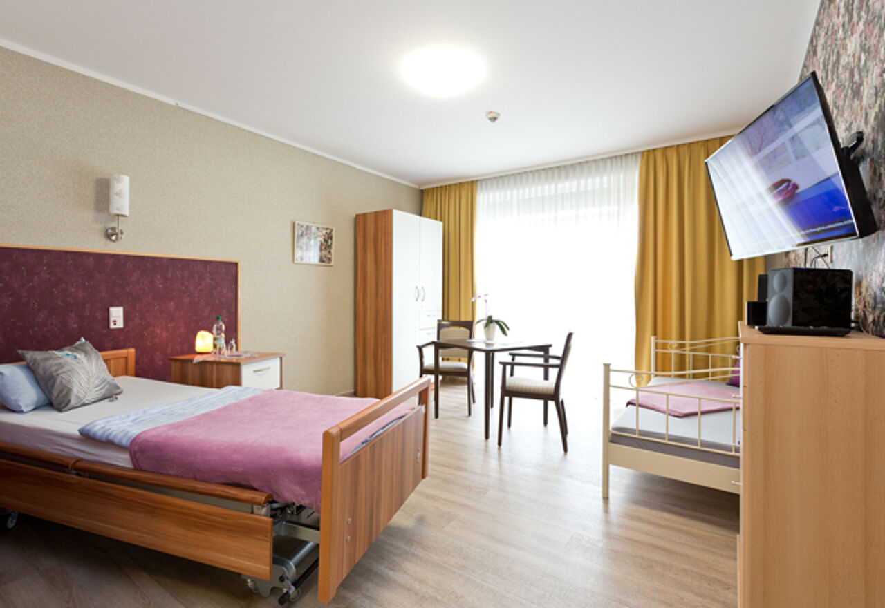 Die Zimmer sind lichtdurchflutet und individuell eingerichtet mit einem Pflegebett, Schrank, Fernseher & einer Schlafcouch.