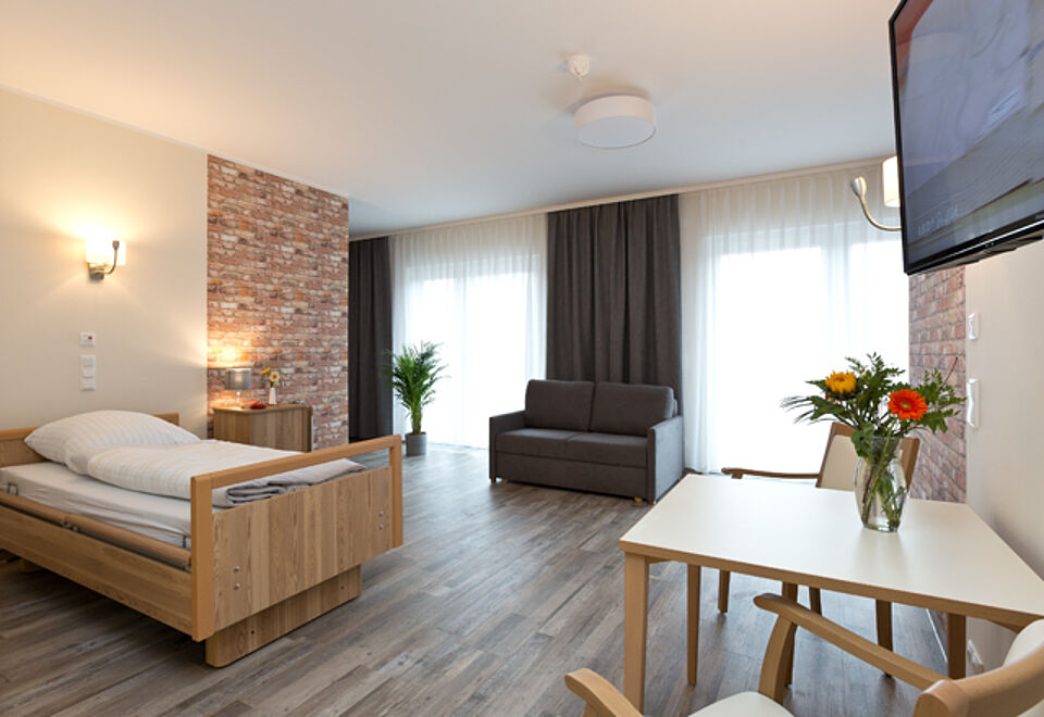 Die Zimmer sind lichtdurchflutet und individuell eingerichtet mit einem Pflegebett, Schrank, Fernseher & einer Schlafcouch.